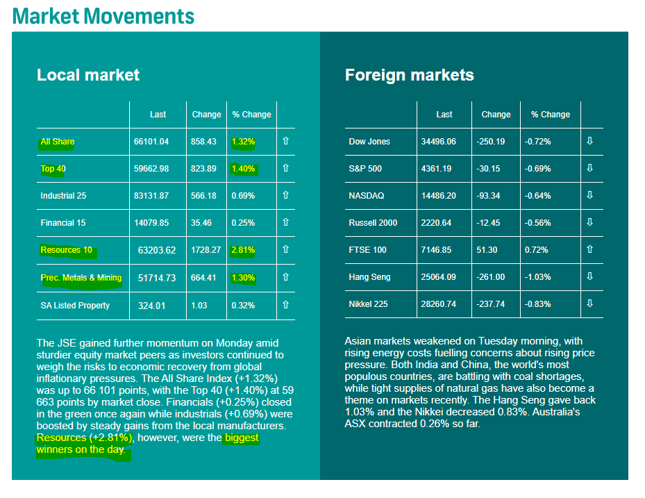 Yesterday saw pleasing positive movements in the local markets, particularly in Resourses and in Mineralsa and Mining.